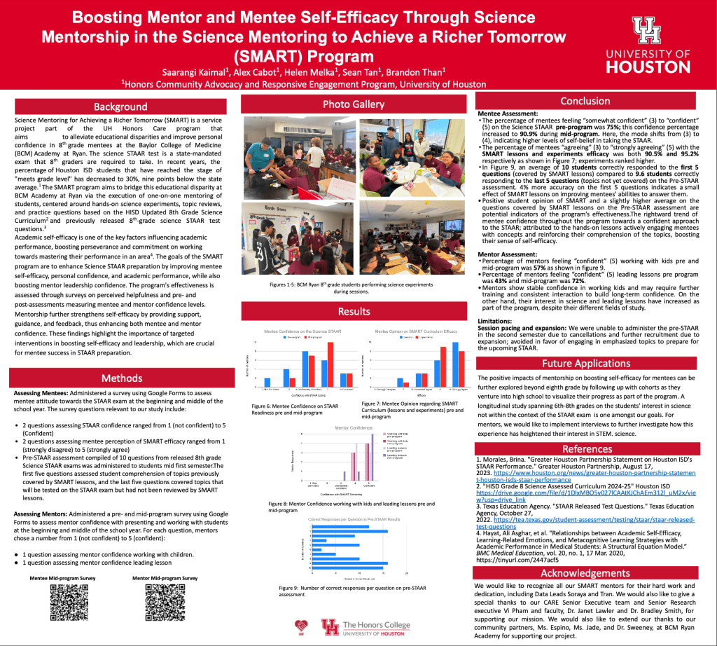 We don’t just teach, we evaluate. In Spring 2025, we presented a research poster titled Boosting Mentor and Mentee Self-Efficacy Through Science Mentorship in the Science Mentoring to Achieve a Richer Tomorrow (SMART) Program at the University of Houston’s 20th Undergraduate Research Day. Through surveys and data analysis, we found that 90.9% of students reported increased confidence in science, and mentors themselves reported higher confidence in teaching and communication. This evidence validates our program’s structure and motivates us to keep improving.